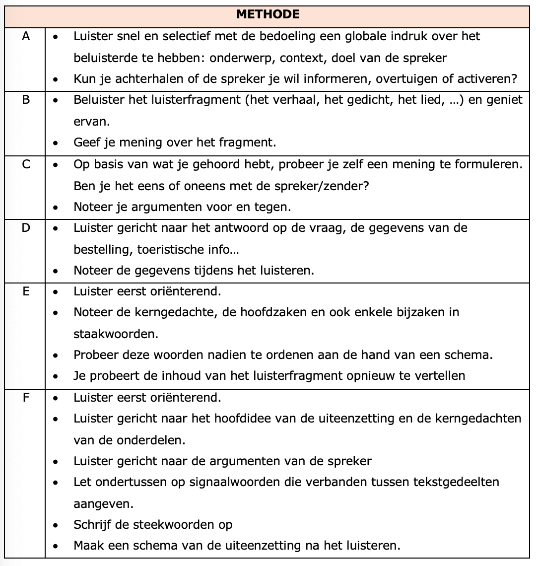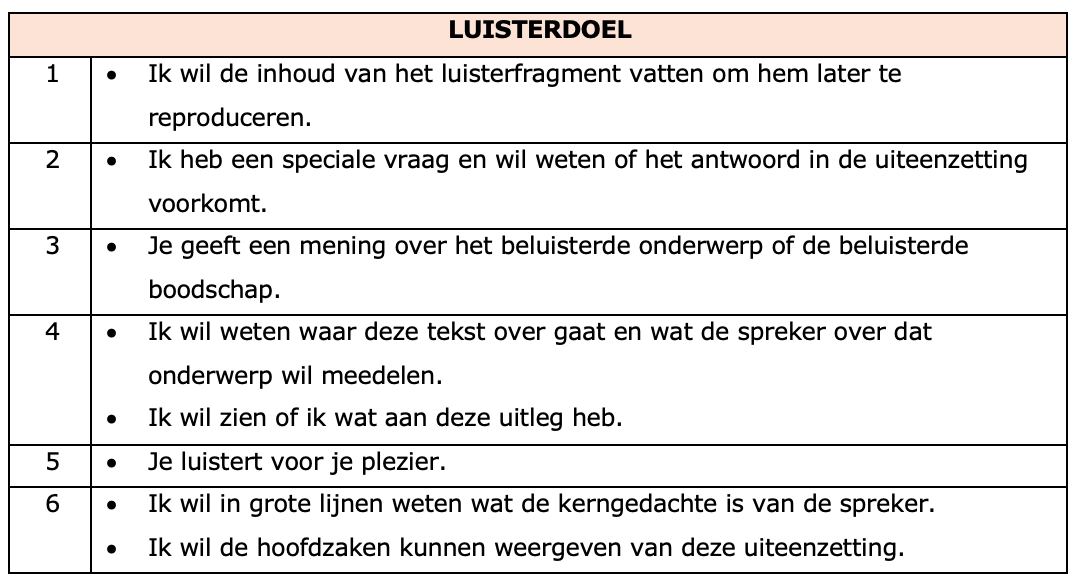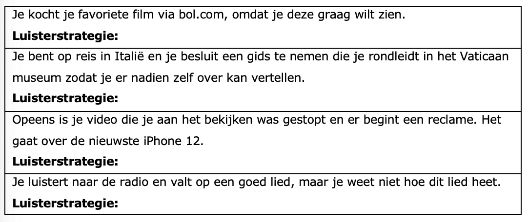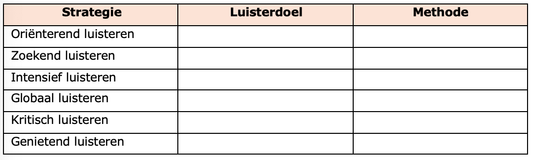 Plaats de juiste methode en het juiste luisterdoel bij de gevraagde strategie in je werkbundel.