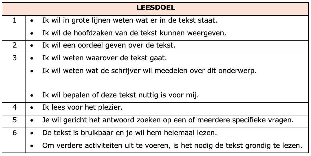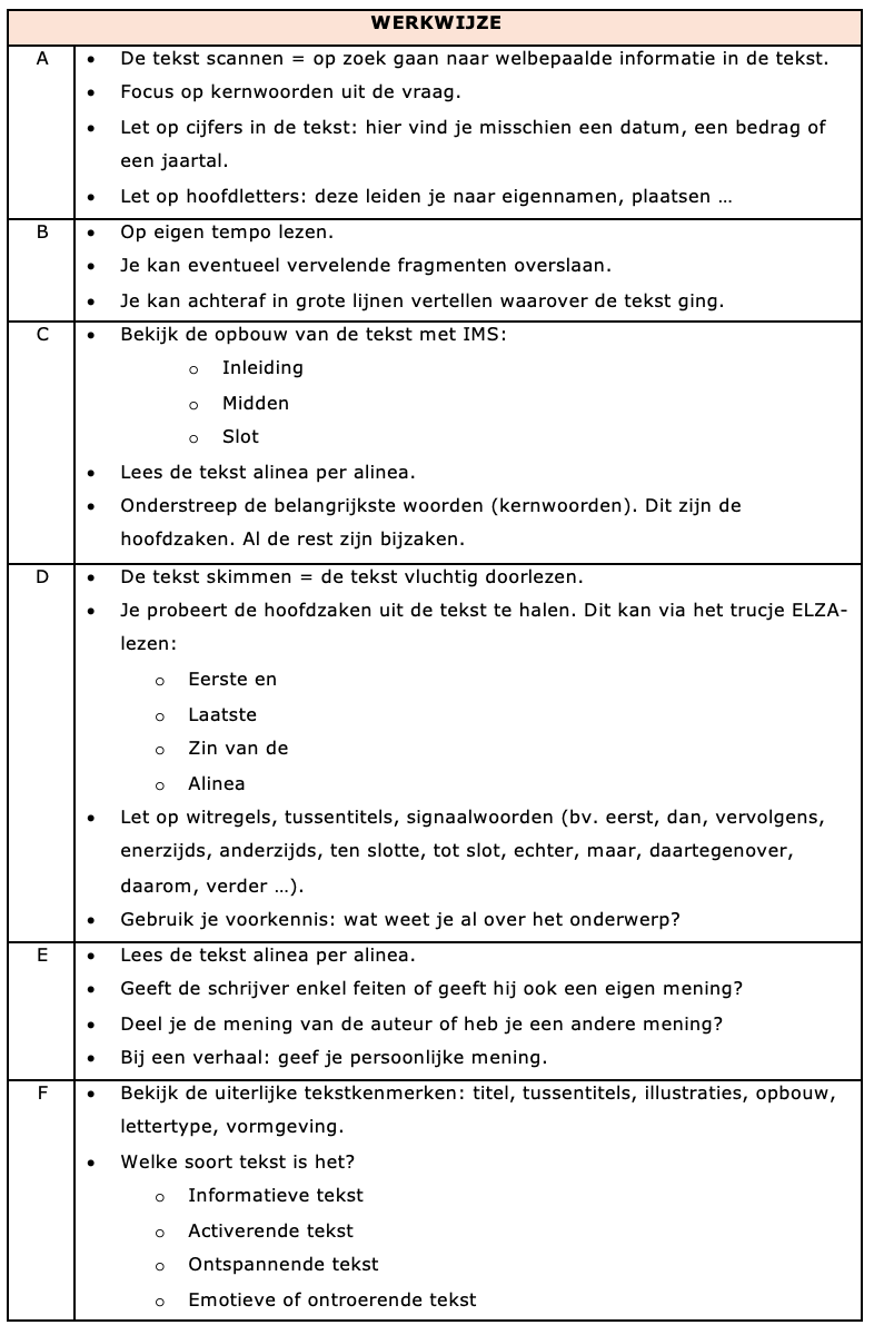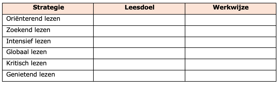 Plaats de juiste werkwijze en het juiste leesdoel bij de gevraagde strategie in je werkbundel.