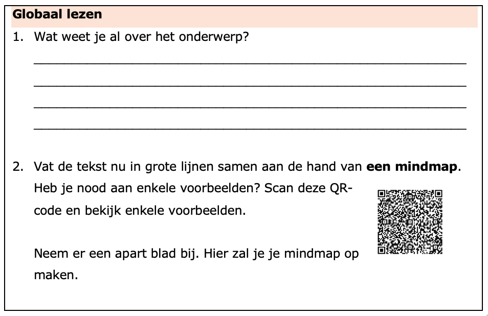 Het is aan jou om nu de verschillende leesstrategieën toe te passen. Dit doe je aan de hand van een dobbelsteen. Gooi telkens met de dobbelsteen en scan vervolgens de QR-code om naar de leestekst te gaan.
